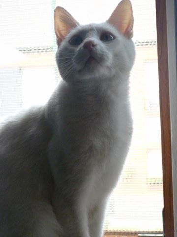 Mon histoire : Trouvé affamé dans la rue, ce chat blanc est tellement heureux de pouvoir manger à sa faim qu’il redouble d’amour envers les personnes qui l’approchent !