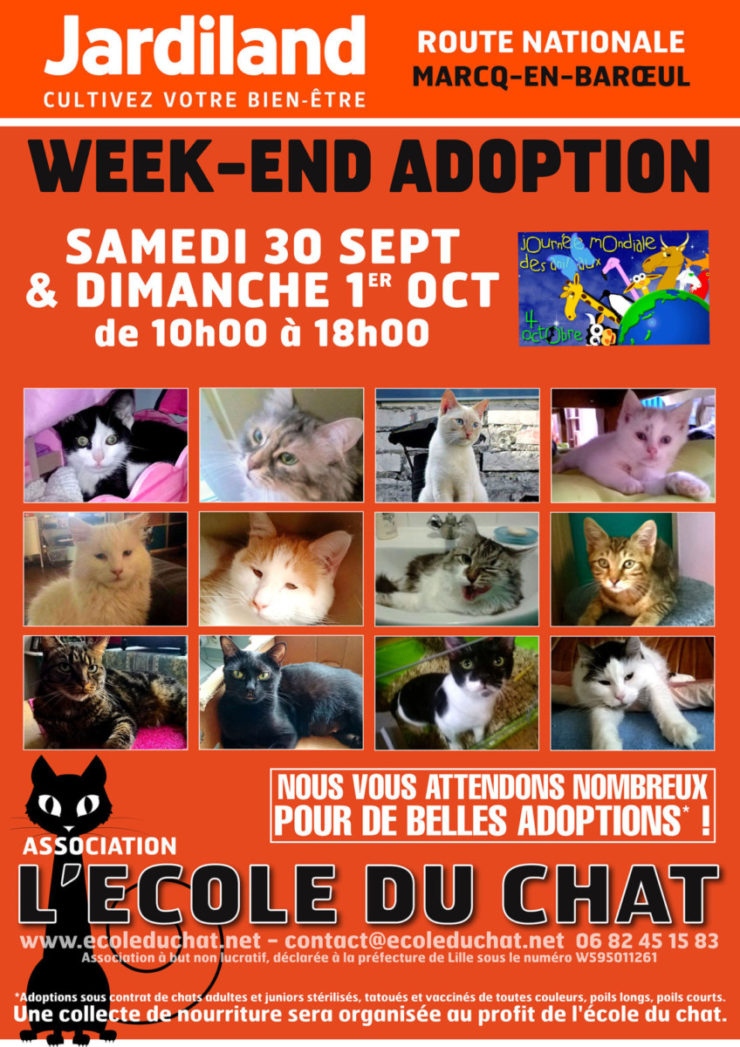 L’Ecole du chat de Marcq organise un week-end d’adoption le 30 septembre et le 1er ocotbre au Jardiland de Marcq-En-Baroeul. Cet événement se déroulera de 10h à 18h.