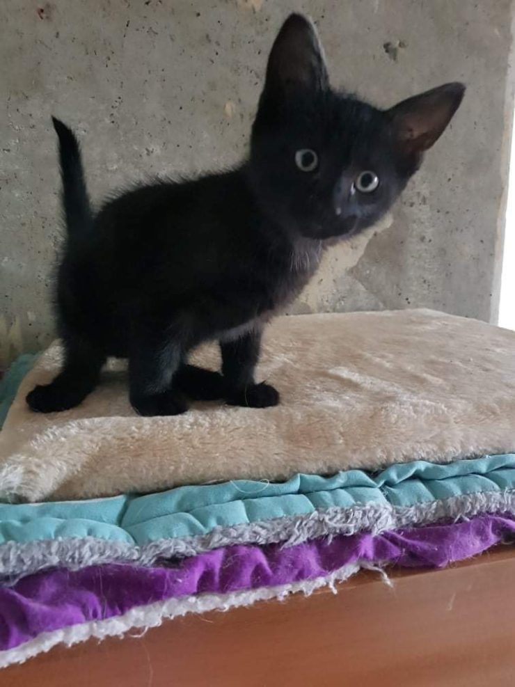 Adorable chaton « perle noire » mâle de 2 mois et demi . Actuellement il est en famille d’accueil avec chien et chats !!!