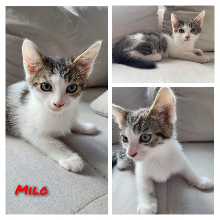 MILO, chaton mâle de 2 mois et demi, très câlin et joueur, fait partie d’une fratrie née au domicile de l’une de nos bénévoles. Nous avons récupéré sa maman quelques heures avant son accouchement !!
