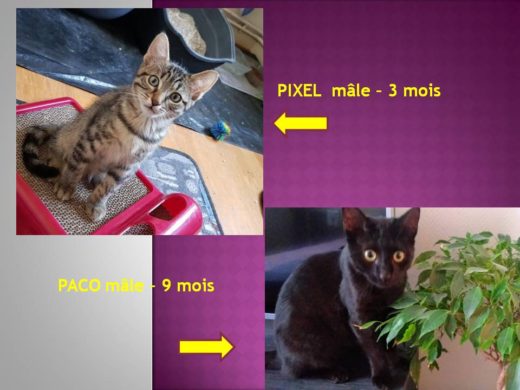 Adoptés en octobre 2019 PIXEL – gentil mâle de 3 mois – joueur et charmeur PACO – tendre mâle de 9 mois castré et puçé (OK chats et enfants)PIXEL est visible à WattrelosAdoption sous contrat EcoleLire la suite
