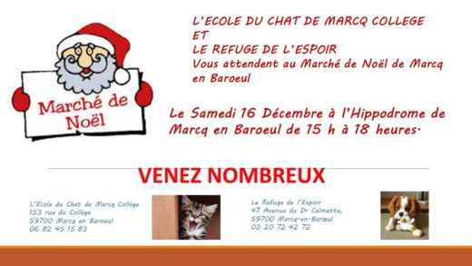 L’école du chat de Marcq Collège et le Refuge de l’espoir seront présents sur le marché de Noël de Marcq en Baroeul. Cela se déroule le samedi 16 décembre à l’Hippodrome de Marcq de 15hLire la suite