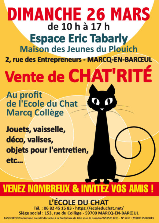 Venez nous retrouver le dimanche 26 mars 2017 lors de notre grande vente de Chat’Rité au profit de l’école du chat de Marcq – Collège. Au programme : vente de jouets, vaisselle, déco, valises, objetsLire la suite