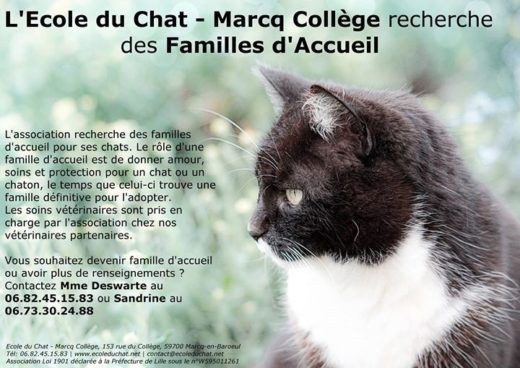 L’école du chat recherche activement des familles d’accueil pouvant accueillir un ou plusieurs chats en attendant leur adoption. Si vous êtes intéressés, sérieux, motivés et responsables, merci d’appeler Danielle au : 06 82 45 15 83Lire la suite